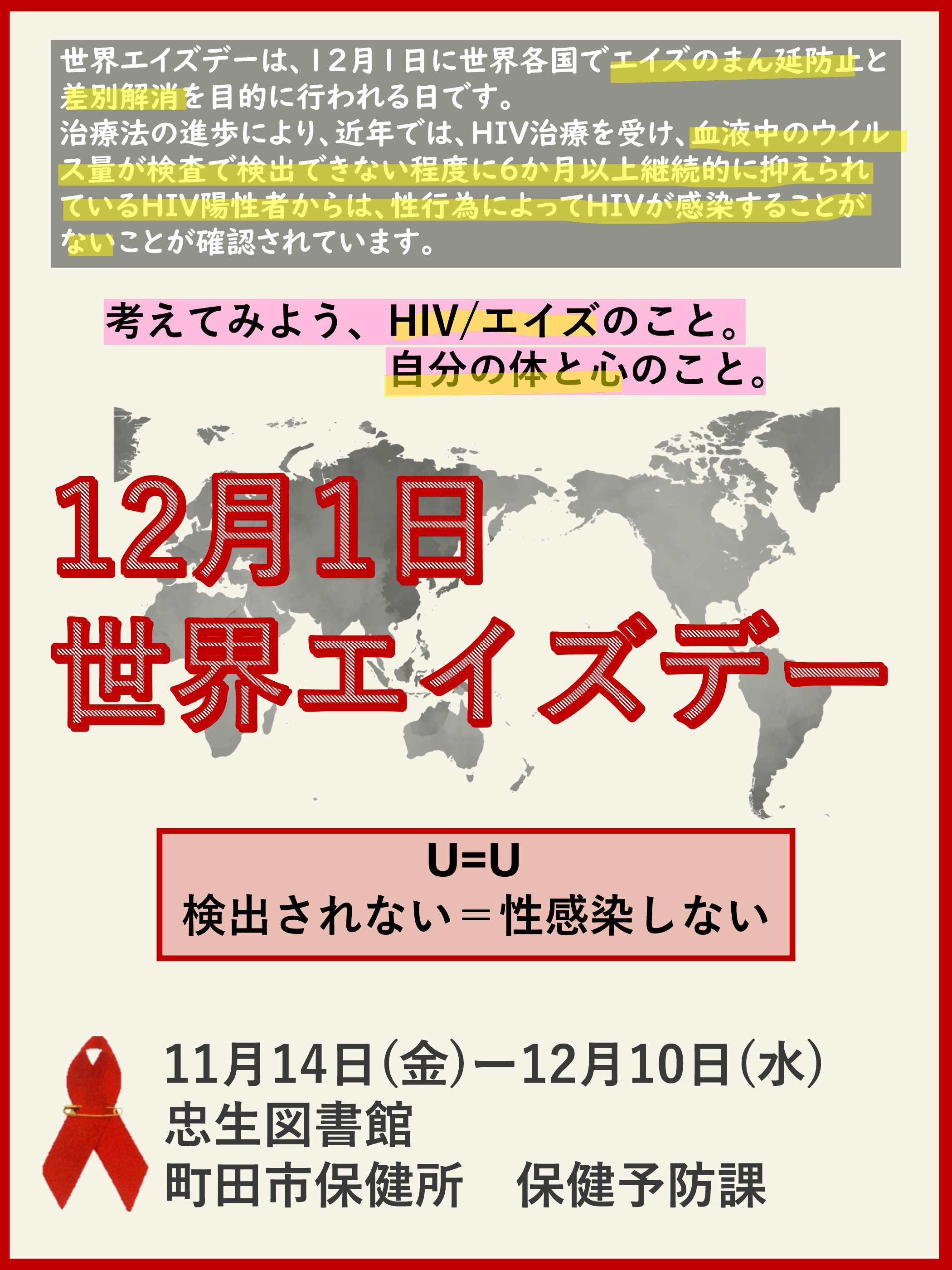 | 忠生図書館 | 12月1日世界エイズデー | 保健予防課 | 042-722-0626 | |