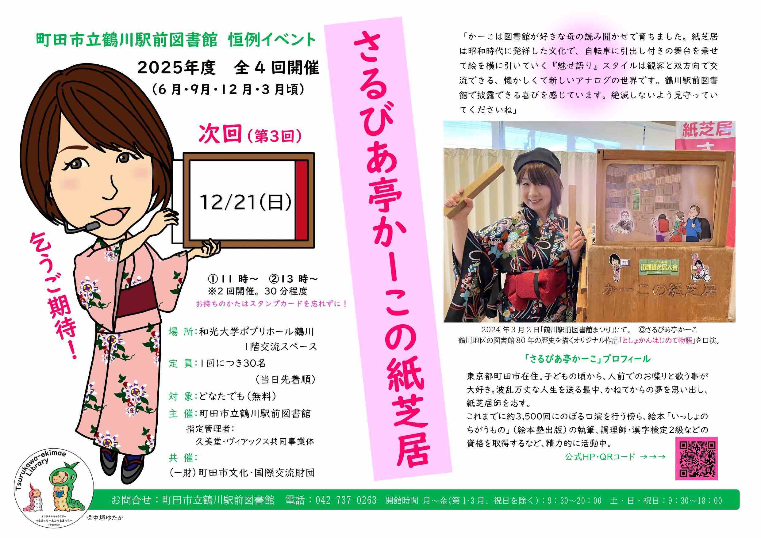 行事 2025年11月15日 町田市の皆さまご存知、「さるびあ亭かーこ」さんの紙芝居です!お子様から大人の方まで、どうぞお楽しみくださいませ。参加費は無料です。※当日は受付でこの画面をお見せください。 表を左右方向にスクロールできます。 日 時 2025年12月21日(日曜日)午前11時から11時30分、午後1時から1時30分の2口演開催 場 所 和光大学ポプリホール鶴川 1階・交流スペース 定 員 1口演30名 対 象 どなたでも 申 込 当日受付・先着順 【問い合わせ先】鶴川駅前図書館 042-737-0263