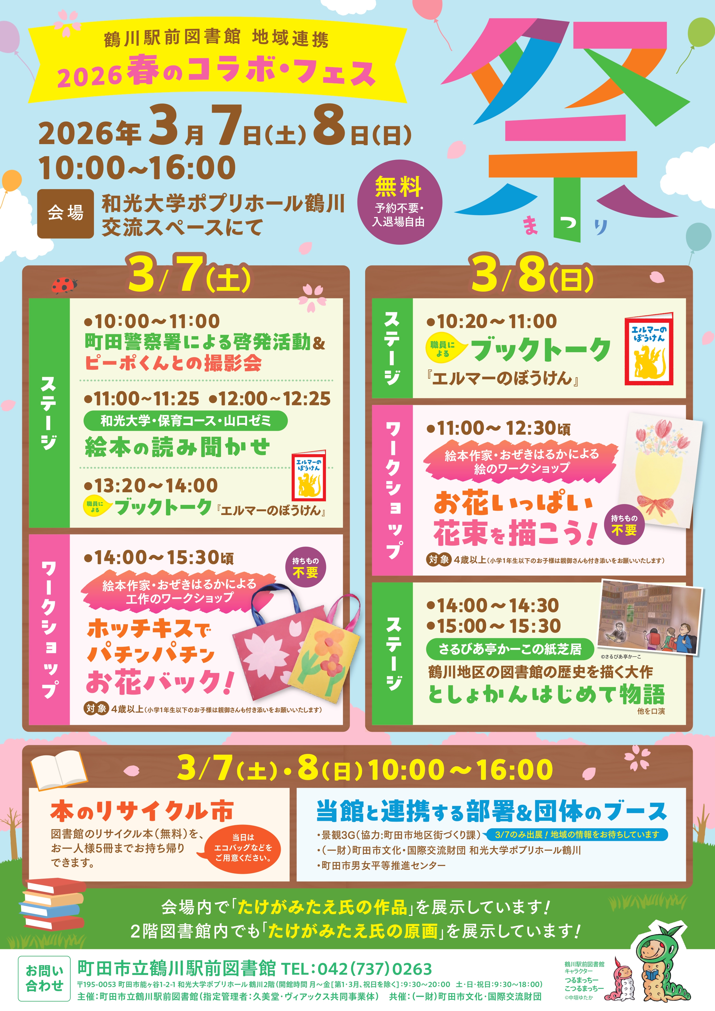 他にも鶴川駅前図書館と連携する部署&団体のブースや、本のリサイクル市、職員によるブックトークを行います!